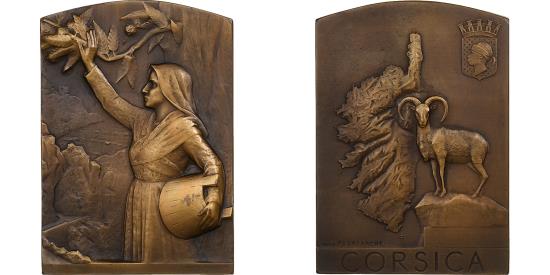 | | France, Medal, Corsica, Bronze, Patriarche, | | | Veiled woman, standing left, holding a basket against her with her left hand and picking chestnuts with her right arm raised, rocks behind and tree trunk on right., Mouflon on a rock, island of Corsica behind and island coat of arms top right., CORSICA | | FEATURES |