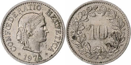 | | Switzerland, 10 Rappen, 1974, Bern, Copper-nickel, , KM:27 | | | Crowned head right, Value within wreath, CONFOEDERATIO HELVETICA Karl Schwenzer | | FEATURES |