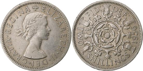| | Great Britain, Elizabeth II, Florin, Two Shillings, 1956, Copper-nickel | | | Laureate bust right, Tudor rose at center, thistle and shamrock wreath surround, without BRITT OMN Mary Gillick | | FEATURES |