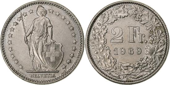 | | Switzerland, 2 Francs, 1969, Bern, Copper-nickel, , KM:21a.1 | | | Standing Helvetia with lance and shield within star border, Value within wreath | | FEATURES |