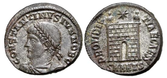 Constantine II, as Caesar, 317 - 337 AD AE Follis, Antioch Mint, 20mm, 3.23 grams Obverse: CONSTANTINVS IVN NOB C, Laureate, draped and cuirassed bust of Constantine left. Reverse: PROVIDENTIAE CAESS, Campgate with no doors, two turrets and star above, SMANTS in exergue. RIC 65 |
