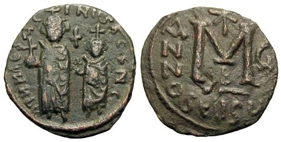 Reign: Emperor, A.D. 610-641. Denomination: Æ Follis. Diameter: 28 mm. Weight: 9.34 grams. Mint: Seleucia Isauriae. Date Struck: Uncertain regnal year (RY 7 or 8, A.D. 616/7 or 617/8). Obverse: Crowned, draped figures of Heraclius, on left, and Heraclius Constantine, on right, standing facing, each holding globus cruciger; cross above. Reverse: Large M.