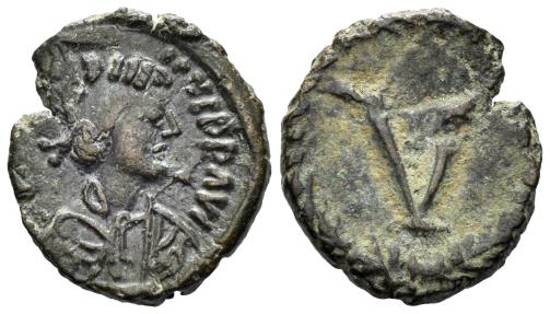 Justinian I. 527-565. AE Pentanummium (1.57g, 13mm). Rome mint. Obv.: D N IVSTIN - IANVS PP AV (or similar), diademed, draped and cuirassed bust of Justinian I right. Rev.: large V within wreath. SB 309; DOC 327. Double struck, gVF.