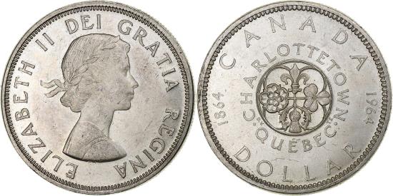 | | Canada, Elizabeth II, Dollar, 1964, Royal Canadian Mint, Silver, | | | Laureate bust right, Design at center, dates at outer edges, denomination below | | FEATURES |