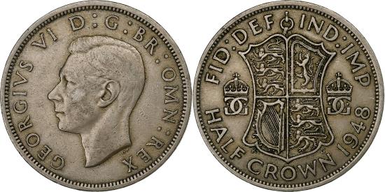 | | Great Britain, George VI, 1/2 Crown, 1948, Copper-nickel, , KM:879 | | | Head left, Quartered shield flanked by crowned monograms, T. H. Paget | | FEATURES |