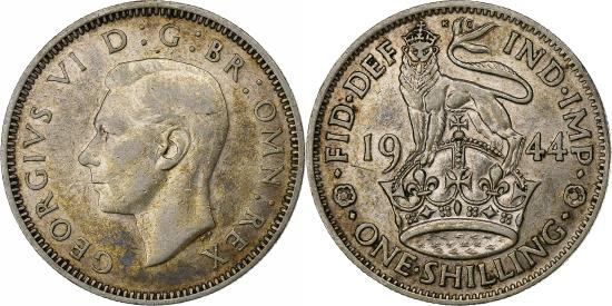 | | Great Britain, George VI, Shilling, 1944, Silver, , KM:854 | | | Head left, Scottish crest; lion seated atop crown holding sword and scepter divides date, shields flank, T. H. Paget | | FEATURES |