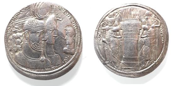 tyle A. 'Ctesiphon' mint. Jugate busts of Vahrām (Bahram), wearing winged crown with korymbos, and his queen, wearing kolah with boar’s head, right, vis-a-vis bust of Prince 4, wearing kolah with eagle’s head, left / Fire altar; flanked by two attendants facing outward, w\each wearing winged crown with korymbos; fravahr to left of flames. SNS type VIa(1)/2(1a), Style A; Sunrise –. 27MM . 4.09gm |