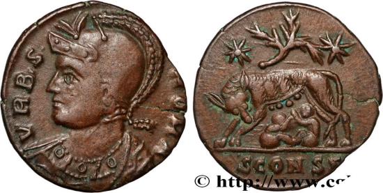 Anépigraphe/ (palme)// SCONST La Louve à gauche allaitant Rémus et Romulus ; au-dessus, deux étoiles