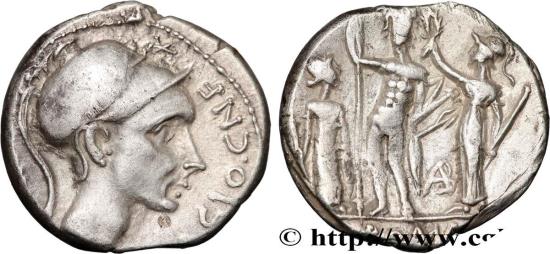 CORNELIA Denier 112-111 AC. Rome R2 silver Obverse : BLASIO CN. F. Tête imberbe de Mars à droite coiffé du casque corinthien à aigrette ; au-dessus du casque, marque de valeur (XVI) en monogramme ; derrière, une couronne Reverse : ROMA à l’exergue La Triade Capitoline : Jupiter au centre, Junon à gauche, Minerve à droite debout de face ; Jupiter est nu, tenant un sceptre de la main droite et un foudre de la main gauche ; Junon est drapée et tient un bâton terminé par une tête d’animal et un bouclier ; Minerve tient une couronne de la main droite et couronne Jupiter ; dans le champ inférieur à droite entre Jupiter et Minerve, A Commentary : Flan court, centré des deux côtés. Joli portrait, bien venu à la frappe. Revers agréable. Patine grise