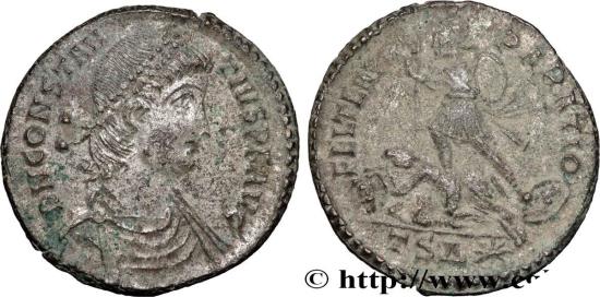 CONSTANTIUS II Augustus Maiorina 351 Macédoine, Thessalonique copper Obverse : D N CONSTAN-TIVS P F AVG Buste diadémé, drapé et cuirassé de Constance II à droite, vu de trois quarts en avant (Aa) Reverse : FEL TEMP RE-PARATIO//TS(delta)* Soldat casqué, vêtu militairement, tenant un bouclier sur le bras gauche et une haste de la main droite terrassant un cavalier tombé au sol couché sur son cheval qui est tourné à droite Commentary : Monnaie centrée. Joli buste. Revers agréable. Avec son argenture. Patine grise