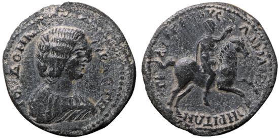 Julia Domna, 192 - 217 AD AE29, 12.09 grams, Mysia, Hadrianothera Mint, Diogenes, as Strategos Obverse: Draped bust of Julia right. Reverse: Septimius Severus on horseback prancing right holding reins and raising hand in salute. SNG France 1095 // SNG von Aulock 1152 Rare. An unusual die break resulting in a large forehead and nose on Julia! ex Musa Numismatic Art, ex Marstetter Collection, ex W.B. and R.E. Montgomery Collection.