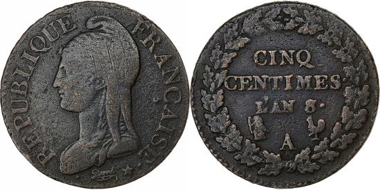 | | France, 5 Centimes, Dupré, AN 8/5, Paris, Copper, , Gadoury:126a | | | FEATURES |