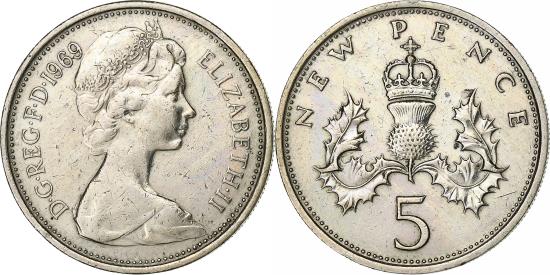 | | Great Britain, Elizabeth II, 5 New Pence, 1969, Copper-nickel, , KM:911 | | | Young bust right, Crowned thistle, Arnold Machin | | FEATURES |