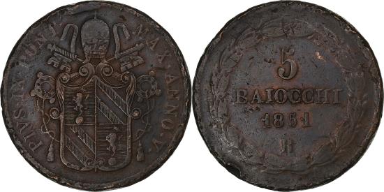 | | Papal States, Pius IX, 5 Baiocchi, 1851, Rome, Copper, , KM:1356 | | | FEATURES |