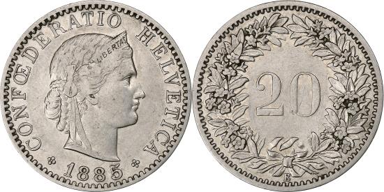 | Switzerland, 20 Rappen, Libertas, 1885, Bern, Nickel, , KM:29 |