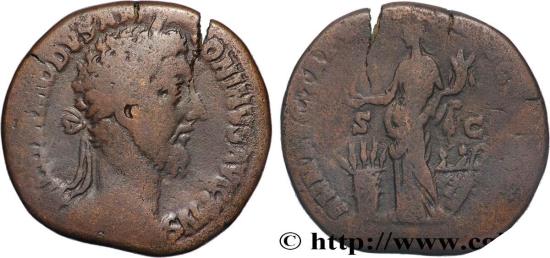 COMMODUS Augustus Sesterce 183 Rome R2 bronze Obverse : M COMMODVS ANTONINVS AVG PIVS Tête laurée de Commode à droite (O*) Reverse : ANNO AVG TR P VIII IMP VI COS IIII P P/ S|C Annona (l’Annone) debout de face, la tête tournée vers la gauche, tenant une statuette de Concordia de la main droite, au-dessus d’un modius et une corne d’abondance de la main gauche ; à droite, une poupe de bateau avec deux marins Commentary : Flan large, centré, éclaté à 1h. Joli portrait. Usure importante mais régulière. Patine marron