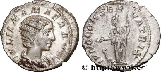 JULIA MAMAEA Daughter of Julia Maesa, mother of Severus Alexander - Augusta Denier 222 Rome silver Obverse : IVLIA MAMAEA AVG Buste drapé de Julia Mamée à droite, vu de trois quarts en avant (L) Reverse : IVNO CONSERVATRIX Junon voilée debout à gauche, tenant une patère de la main droite et un sceptre de la gauche ; à ses pieds à gauche, un paon, tournant la tête à droite Commentary : Superbe exemplaire sur un flan idéalement centré des deux côtés. Buste de toute beauté, finement détaillé. Joli revers. Patine grise