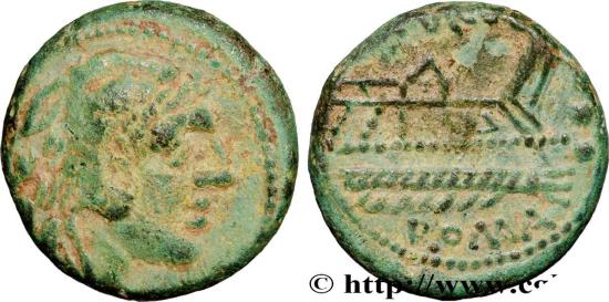 Anépigraphe Tête imberbe d’Hercule coiffée de la léonté ; derrière trois globules posés verticalement