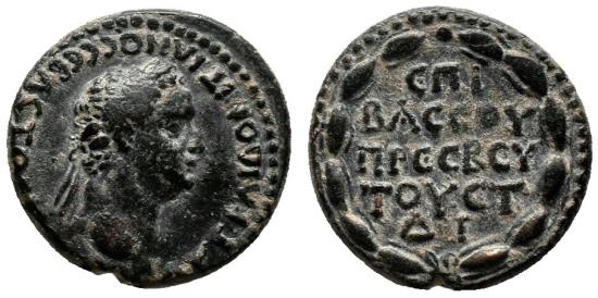 Obverse: AYT KAI ΔOMITIANOC CЄBACTOC (ΓЄPMA). Laureate head right. Reverse: ЄΠI BACCOY ΠPЄCBЄY-TOY ЄT ΔΙ, legend in five lines within wreath. Very nice coin, in VF+ condition, conserving almost complete details, bold reliefs and a precious dark green patina. RPC II 1688. Caesarea (Cappadocia) mint, dated year 14 = AD 94/95. 7 g - 19,5 mm -------------------------------------------------------------------------------------------------- Visit our site about Numismatics and Archaeology: aeternitas-numismatics.com |