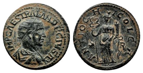 Obverse: IMP CAES TRAIAN DECIVS AV. Radiate, draped and cuirassed bust right. Reverse: ANTIOCHI COL CA / S - R. Felicitas standing facing, wearing kalathos, head left, holding caduceus and cornucopia. Quality coin, looking much better in the hand than in the photo. In EF- conditon, it conserves complete details on bothj sides, very bold reliefs and a precious dark green patina. RPC 1245. Antioch (Pisidia) mint, AD 249-251. 8,6 g - 26 mm -------------------------------------------------------------------------------------------------- Visit our site about Numismatics and Archaeology: aeternitas-numismatics.com |