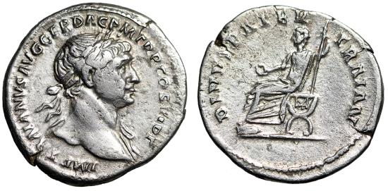 Trajan AR Denarius "Trajan Senior (Pater) Seated" Rome Good Very Fine