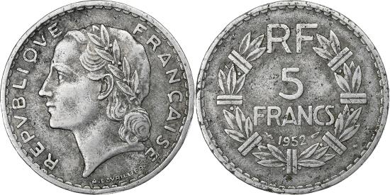 | | France, 5 Francs, Lavrillier, 1952, Paris, Aluminum, , Gadoury:766a | | | Lavrillier, Laureate head left, Denomination above date within sectioned wreath, Without mint mark. | | FEATURES |