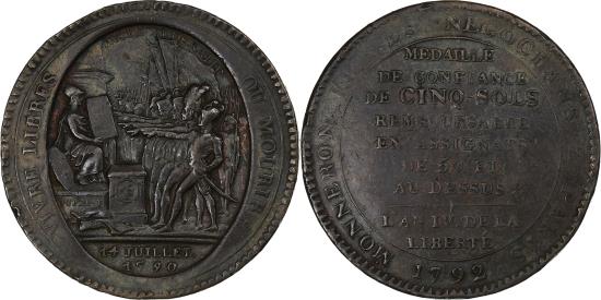 | | France, 5 Sols, Monneron, 1792, Birmingham, Bronze, , KM:Tn31 | | | Allegiance scene, LAN IV is date in inner circle, without T in DEPARTEMENS, VIVRE LIBRES OU MOURIR | | FEATURES |