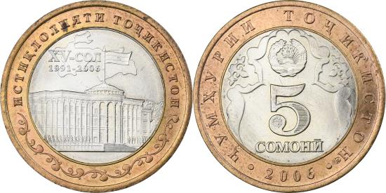 | | Tajikistan, 5 Somoni, 2006, St. Petersburg, Bi-Metallic, , KM:15 | | | National arms above value, Government building | | FEATURES |