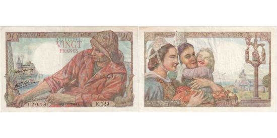 | | France, 20 Francs, Pêcheur, 1944, K.129, AU(55-58), Fayette:13.09, KM:100a | | | Signature P. Rousseau and R. Favre-Gilly. 12.2.1942-17.5.1944., Breton fisherman at right., Two women at left center, Breton calvary statuary at right., Red and multicolor. | | FEATURES |