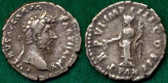 Silver Denarius18mm 3.6 grams ROME O:Laureate bust of Lucius Verus facing r. R:Pax stand left holding olive branch & cornucopiae