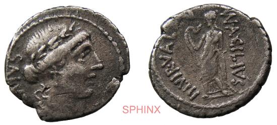 29MM4P) R. Republic, Mn. Acilius Glabrio. 49 BC., AR Denarius 49, AR 18 mm, 4.00 g. Obverse: SALVTIS Laureate head of Salus r. Reverse: MN·ACILIVS – III·VIR·VALETV Valetudo standing l., resting l. arm on column and holding snake in r. hand. Reference: Babelon Acilia 8. Sydenham 922. Sear Imperators 16. RBW 1556. Crawford 442/1a. FINE+ a couple of chips and a banker's mark on Obv. |