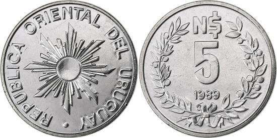 | | Uruguay, 5 Nuevo Pesos, 1989, Pessac, Stainless Steel, , KM:92 | | | FEATURES |