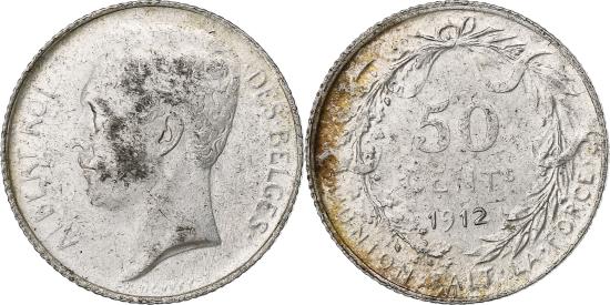 | | Belgium, Albert I, 50 Centimes, 1912, Silver, , KM:70 | | | Head of Albert, left, legend in French, Denomination above date within wreath, DES BELGES | | FEATURES |