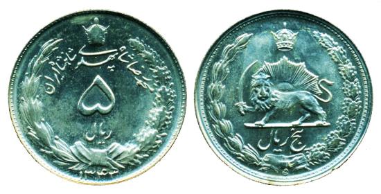 IRAN, PAHLAVI: Muhammad Reza Shah (1320-1357 SH/1941-1979), Copper-Nickle 5 Rials ( 26 mm), Struck SH 1343 (1964), KM#1175a Superb UNCIRCULATED! a beauty!