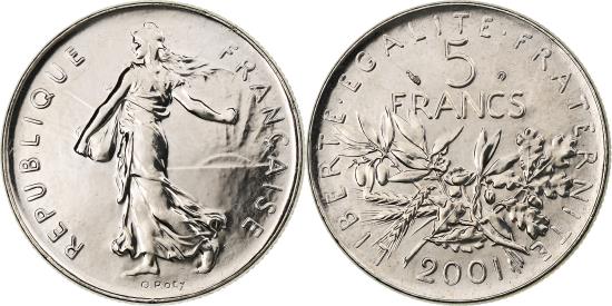 | | France, 5 Francs, Semeuse, 2001, Pessac, Copper-nickel, , Gadoury:771 | | | Semeuse (Sower) walking left, sun in background, engraver under her feet, caption left and right., Value above olive, oak branches and wheat, above date, caption around. | | FEATURES |