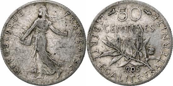 | | France, 50 Centimes, Semeuse, 1905, Paris, Silver, , Gadoury:420 | | | Semeuse, Figure sowing seed, Leafy branch divides date and denomination, Without mint mark. | | FEATURES |