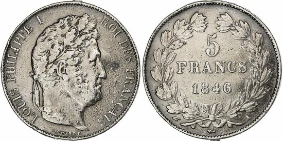 | | France, 5 Francs, Louis-Philippe, 1846, Paris, Silver, , Gadoury:678a | | | Louis-Philippe, Laureate head right, Mint marks at edge outside wreath, LOUIS PHILIPPE I ROI DES FRANCAIS | | FEATURES |