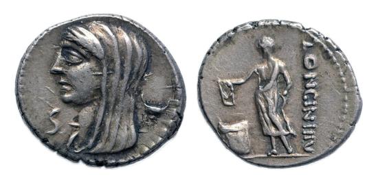 L. Cassius Longinus. 60 BC. AR Denarius (20 mm, 3.86 grams). Rome mint. Veiled and draped bust of Vesta left; retrograde S to left, cylix to right / Voter standing left, dropping tablet inscribed V (Uti rogas) into cista to left; LONGIN II[I V] downward to right. Crawford 413/1; Sydenham 935; Cassia 10; BMCRR Rome 3936; RBW 1493 var. (letter on obv.). Condition: Choice About EF, deep iridescent toning. Perfectly centered on a large flan. |