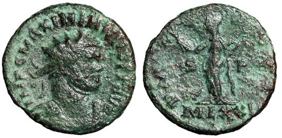 Maximian Antoninianus London (Londinium) Mint 286-293 AD Obverse: IMP C MAXIMIANVS AVG Bust of Maximian radiate, cuirassed, right Reverse: PAX AVGGG Pax, draped, standing left, holding olive-branch in right hand and sceptre in left hand; S-P in fields; MLXXI in exergue References: RIC 35 Rare Size: 22mm, 3.86g Professional Numismatic Notes: Fine; a rare type and a clear, albeit rough example!