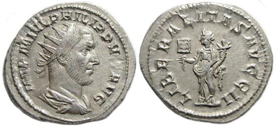 Obv: IMP M IVL PHILIPPVS AVG; Radiate and cuirassed bust right