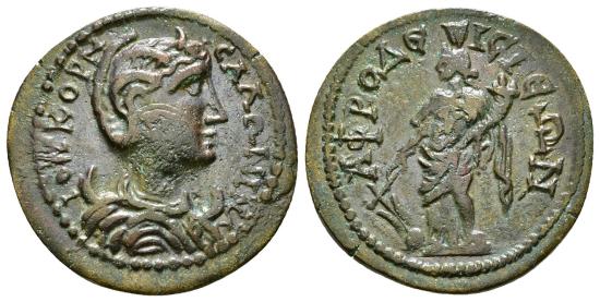 Salonina, 253 - 268 AD, AE25 of Caria, Aphrodisias with Tyche, Rare