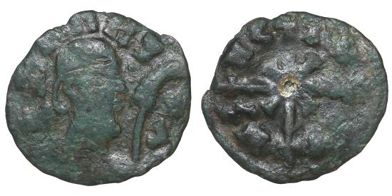 AXUM. Wazena (WZN), circa 610-630. Bronze 0.85 gr. – 14.9 mm. l'Hzb zydl in Ge'ez ('May this please the peoples') Draped bust of Wazena to right, holding grain ear scepter. Rev. zwzn zngs in Ge'ez ('of Wazena, of the king') Cross crosslet with voided center. BMC 414 ff. MH/JJ 118. Gilt on reverse. VF+