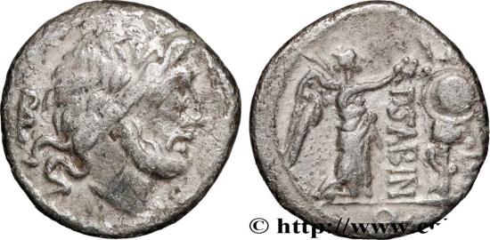 VETTIA Quinaire 99 AC. Rome R1 silver Obverse : Anépigraphe Tête laurée de Jupiter à droite ; derrière la tête, marque de contrôle, (.H.) Reverse : P. SABIN// Q Victoire drapée debout à gauche, tournée à droite, tenant une palme de la main gauche et couronnant de la main droite un trophée d’armes placé dans le champ à droite ; dans le champ inférieur à droite, marque de contrôle, (N) Commentary : Flan centré. Agréable droit malgré l’usure. Des faiblesses. Joli revers bien lisible. Patine grise