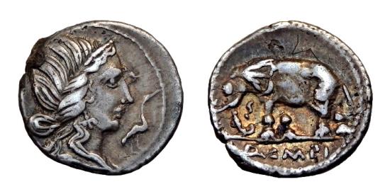 Obverse: Diademed head of Pietas right, to right, stork standing right,