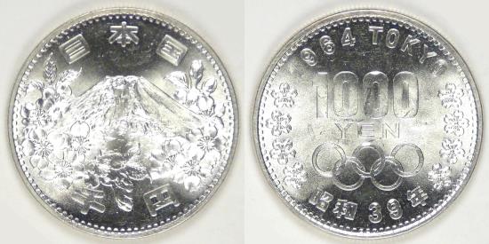 Rev: Big denomination and Olympic rings, cherry blossoms on either side, “1964 Tokyo” above and “Year 39 of Shōwa” below