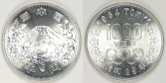 Rev: Big denomination and Olympic rings, cherry blossoms on either side, “1964 Tokyo” above and “Year 39 of Shōwa” below