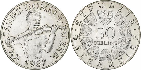 | | Austria, 50 Schilling, 1967, Vienna, Silver, , KM:2902 | | | Johann Strauss the Younger, playing the violin, date below, Edwin Grienauer | | FEATURES |