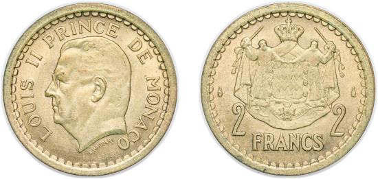 Monaco Principalty ND (1945) 2 Francs - Louis II Aluminium bronze (1082687) 8g UNC KM 121a Gad MC134