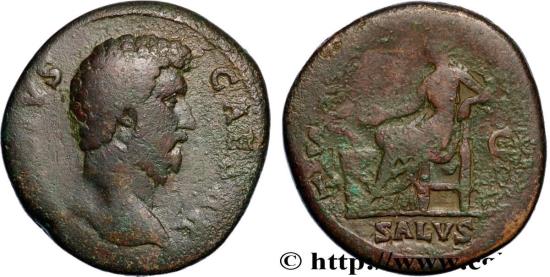 T-R POT - COS - II/ S|C// SALVS Salus (la Santé) drapée, assise à gauche, tenant une patère de la main droite et nourrissant un serpent enroulé autour d’un autel