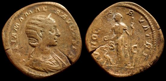 IVLIA MAMAEA AVGUSTA Draped bust right, wearing stephane / IVNO CONSEVATRIX / SC Juno standing slightly left, holding patera and scepter; peacock at feet.